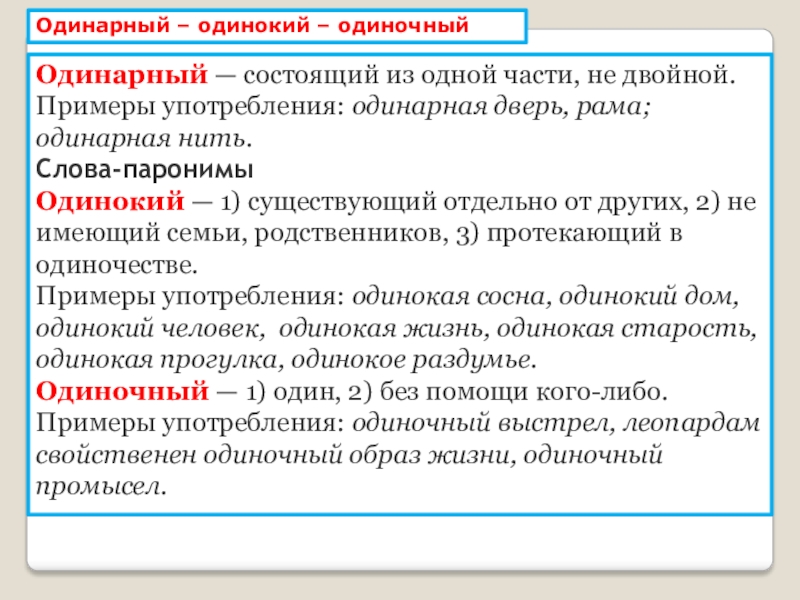 Примеры употребления: одиночный выстрел, леопардам свойственен одиночный образ жизни, одиночный промысел.