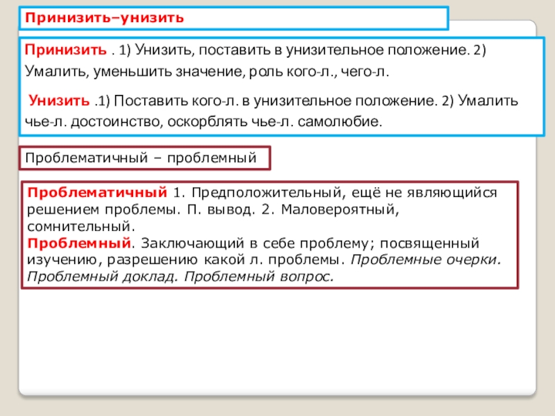 Принизить . 1) Унизить, поставить в унизительное положение. 2) Умалить, уменьшить