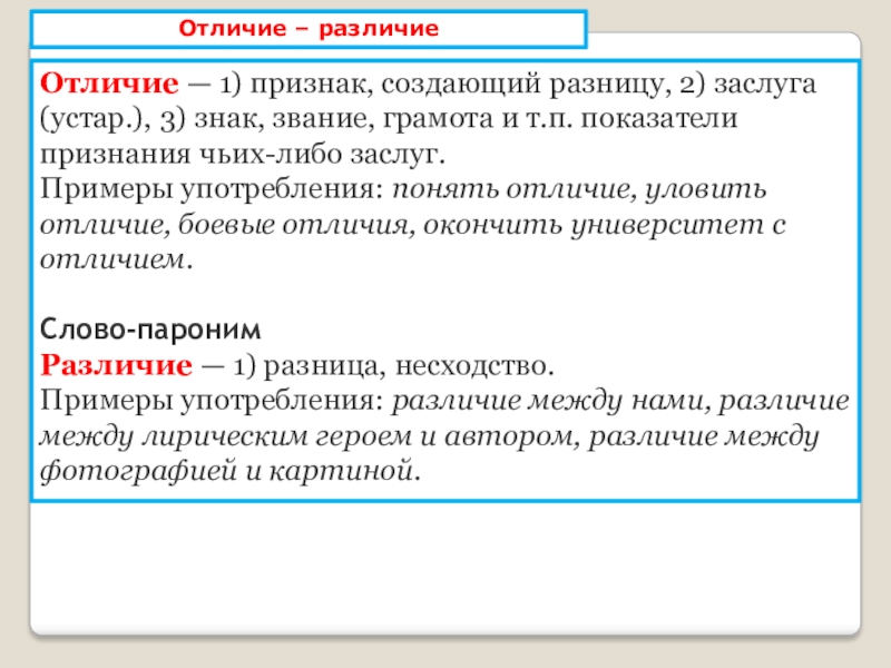 Отличие — 1) признак, создающий разницу, 2) заслуга (устар.),