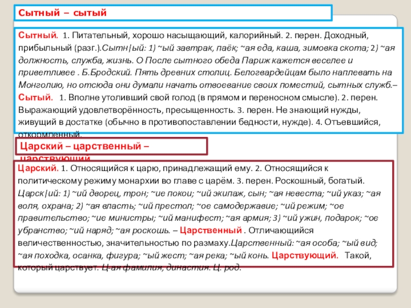 Доходный, прибыльный (разг.).Сытн|ый: 1) ~ый завтрак, паёк; ~ая еда, каша, зимовка скота; 2) ~ая должность, служба, жизнь. О После сытного обеда Париж кажется веселее и приветливее . Б.Бродский. Пять древних столиц. Белогвардейцам было наплевать на Монголию, но отсюда они думали начать отвоевание своих поместий, сытных служб.– Сытый. 1. Вполне утоливший свой голод (в прямом и переносном смысле). 2. перен. Выражающий удовлетворённость, пресыщенность. 3. перен. Не знающий нужды, живущий в достатке (обычно в противопоставлении бедности, нужде). 4. Отъевшийся, откормленный.