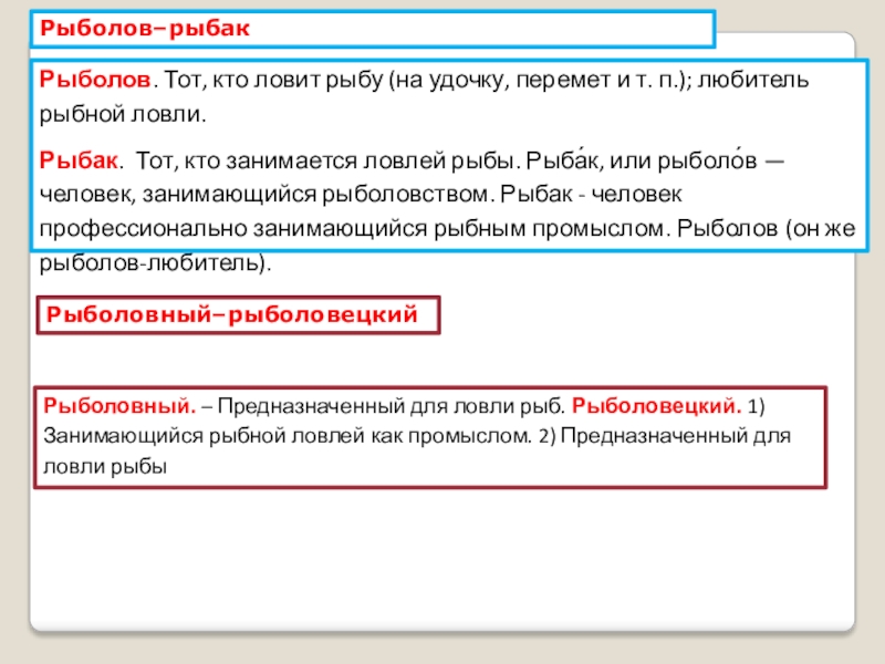 Рыболовный. – Предназначенный для ловли рыб. Рыболовецкий. 1) Занимающийся рыбной ловлей как промыслом. 2) Предназначенный для ловли рыбы