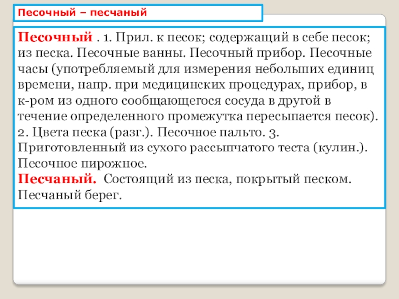 себе песок; из песка. Песочные ванны. Песочный прибор. Песочные часы (употребляемый для измерения небольших единиц времени, напр. при медицинских процедурах, прибор, в к-ром из одного сообщающегося сосуда в другой в течение определенного промежутка пересыпается песок). 2. Цвета песка (разг.). Песочное пальто. 3. Приготовленный из сухого рассыпчатого теста (кулин.). Песочное пирожное.