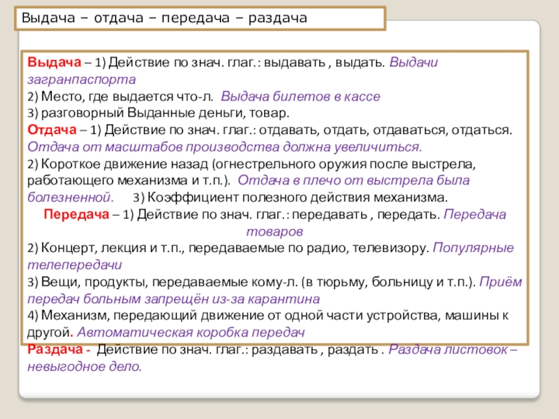 по знач. глаг.: выдавать , выдать. Выдачи загранпаспорта