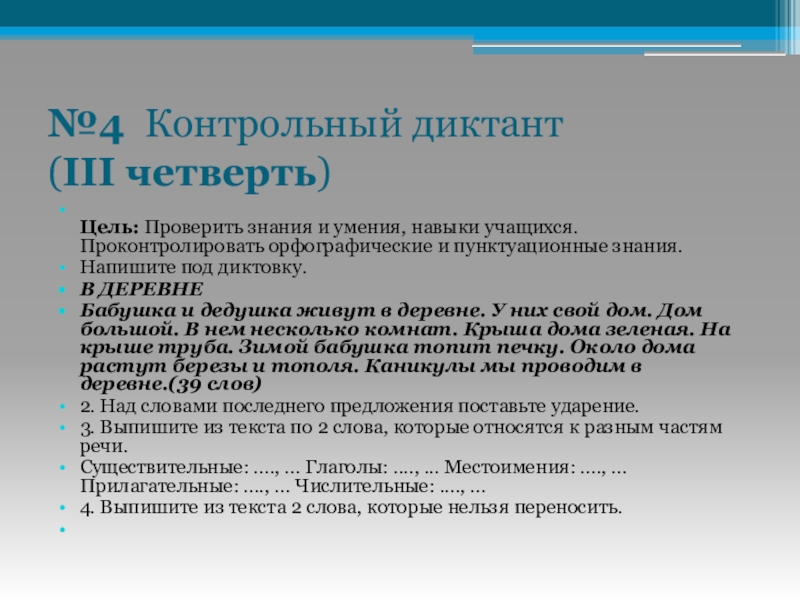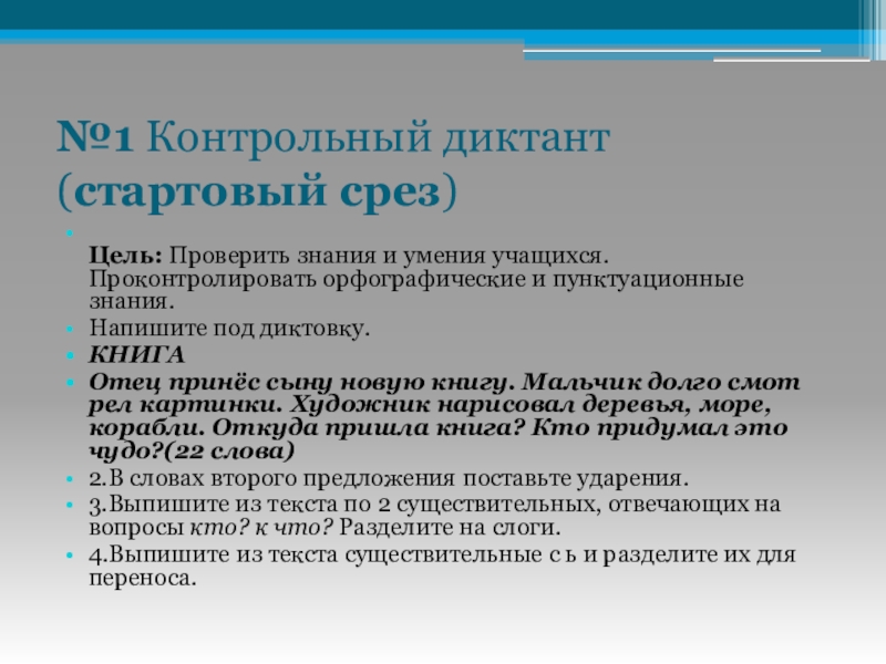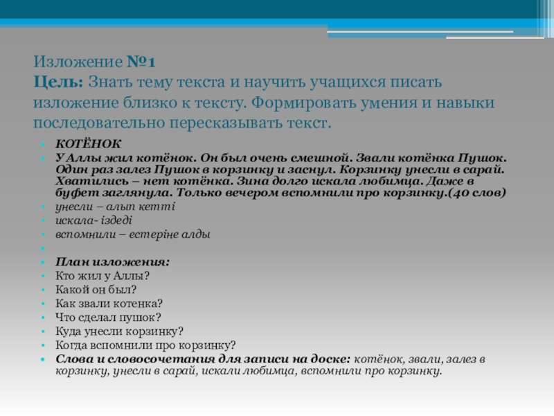 У Аллы жил котёнок. Он был очень смешной. Звали котёнка Пушок. Один раз залез Пушок в корзинку и заснул. Корзинку унесли в сарай. Хватились – нет котёнка. Зина долго искала любимца. Даже в буфет заглянула. Только вечером вспомнили про корзинку.(40 слов)