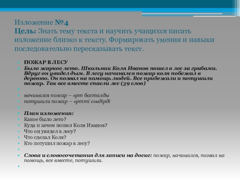 Слова и словосочетания для записи на доске: пожар, начинался, позвал на помощь, все вместе, потушили.
