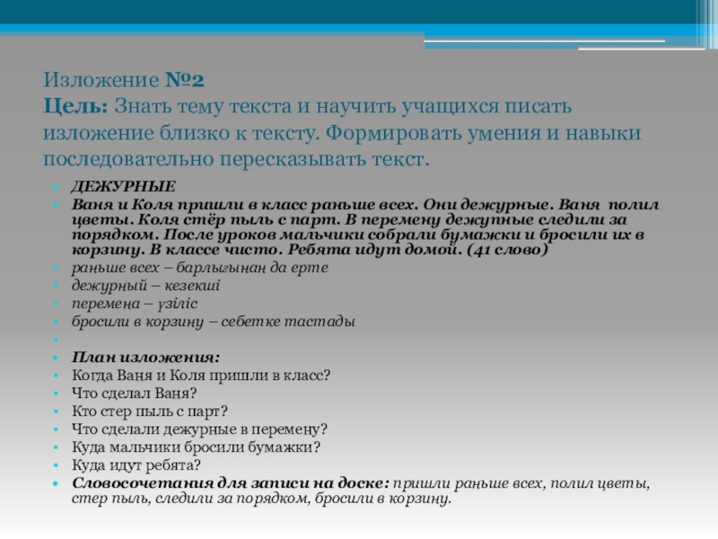 Ваня и Коля пришли в класс раньше всех. Они дежурные. Ваня полил цветы. Коля стёр пыль с парт. В перемену дежупные следили за порядком. После уроков мальчики собрали бумажки и бросили их в корзину. В классе чисто. Ребята идут домой. (41 слово)