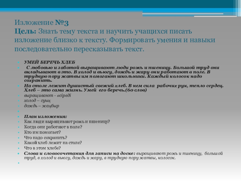 Слова и словосочетания для записи на доске: выращивают рожь и пшеницу, большой труд, в холод и вьюгу, дождь и жару, в трудную пору жатвы, колосок.