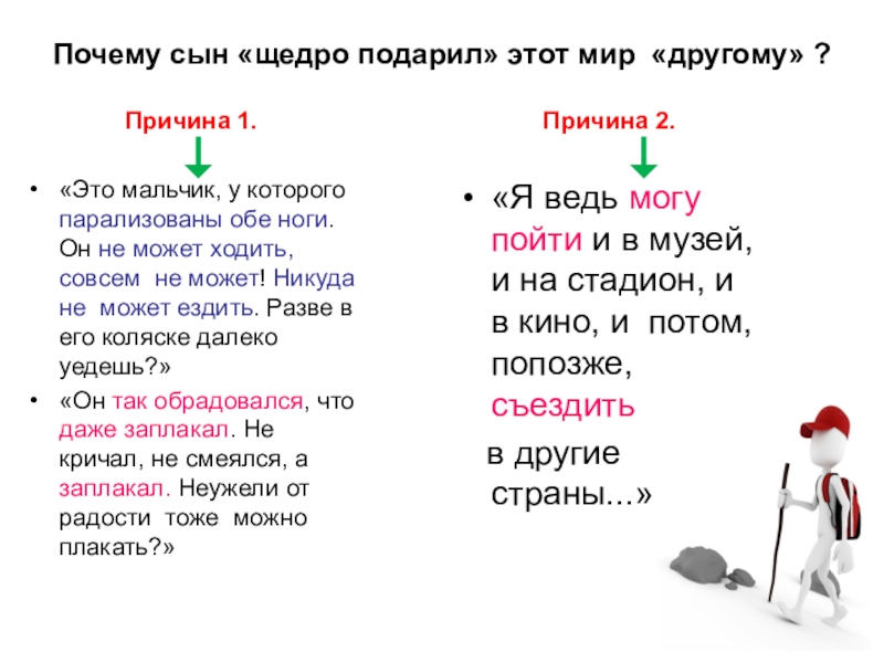(28)- Папа... (29)Это мальчик, у которого парализованы обе ноги, над ним шефствует наша школа. (30)Он не может ходить, понимаешь, - совсем не может! (31)Никуда не может ездить…. (32)Разве в его коляске далеко уедешь? (33)Я подарил ему свой альбом…(34)Ты не будешь очень на меня сердиться, а, пап? (35)Я ведь могу пойти и в музей, и на стадион, и в кино, и потом, попозже, съездить в другие страны...