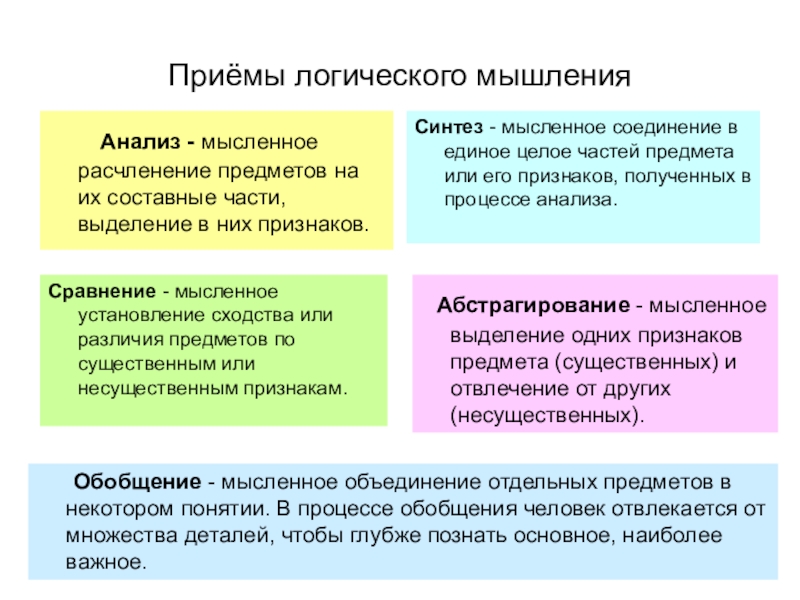Абстрагирование - мысленное выделение одних признаков предмета (существенных) и отвлечение от других (несущественных).