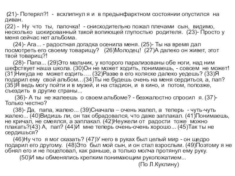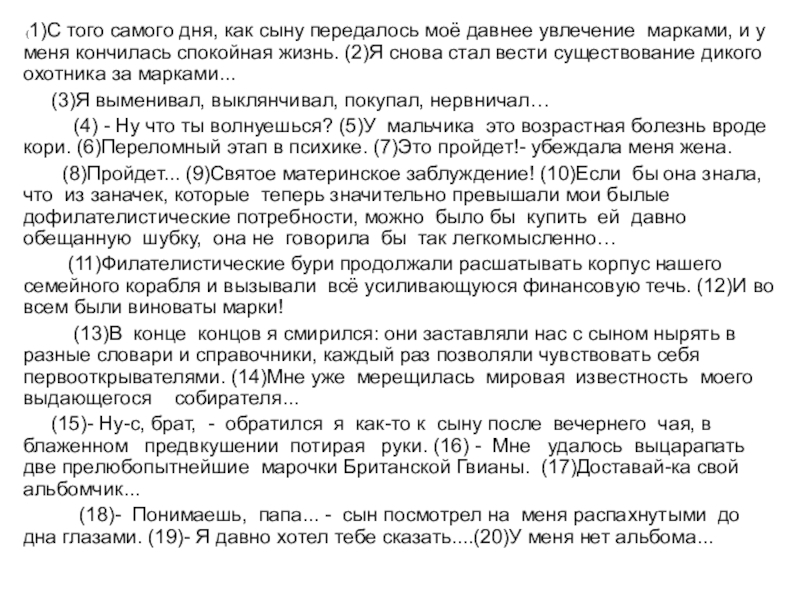 (18)- Понимаешь, папа... - сын посмотрел на меня распахнутыми до дна глазами. (19)- Я давно хотел тебе сказать....(20)У меня нет альбома...