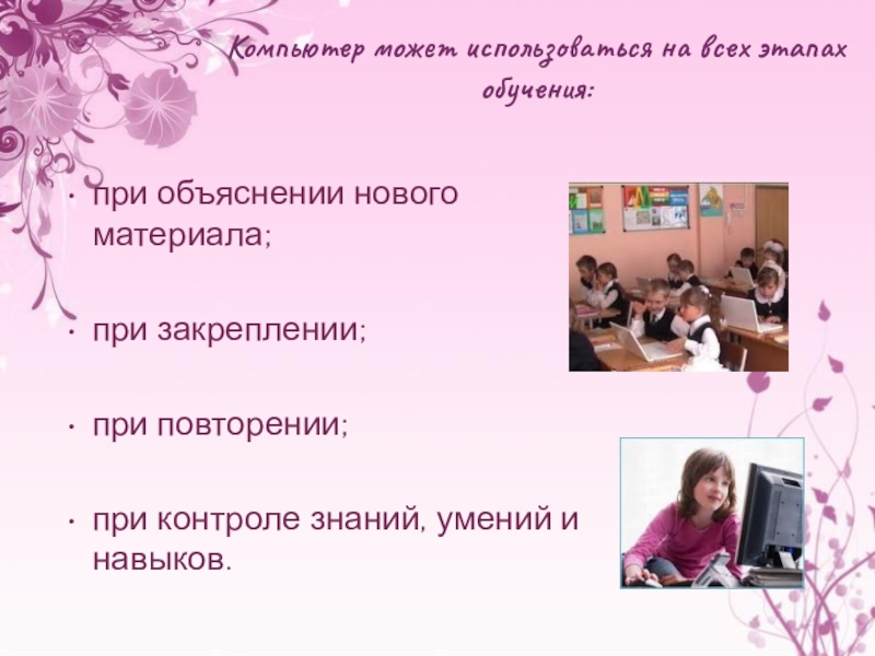 Слайд 7Компьютер может использоваться на всех этапах обучения: