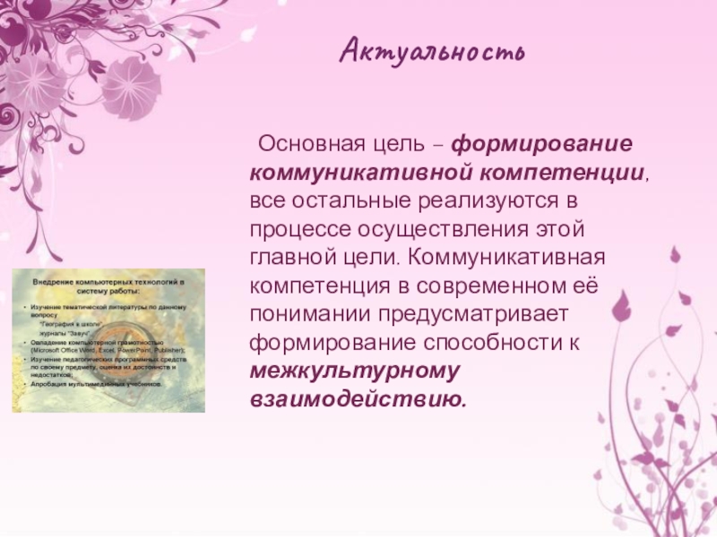 осуществления этой главной цели. Коммуникативная компетенция в современном её понимании предусматривает формирование способности к межкультурному взаимодействию.