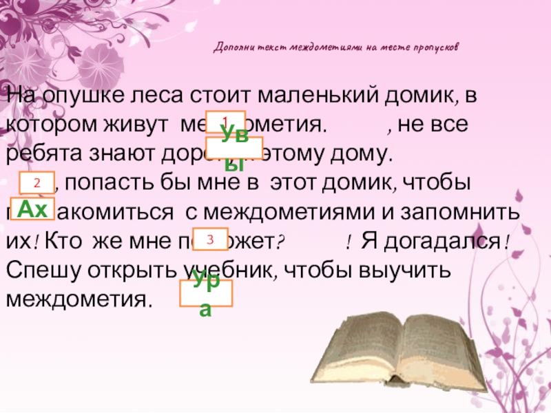 , попасть бы мне в этот домик, чтобы познакомиться с междометиями и запомнить их! Кто же мне поможет? ! Я догадался! Спешу открыть учебник, чтобы выучить междометия.