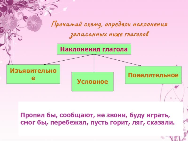 Слайд 15Прочитай схему, определи наклонения записанных ниже глаголов