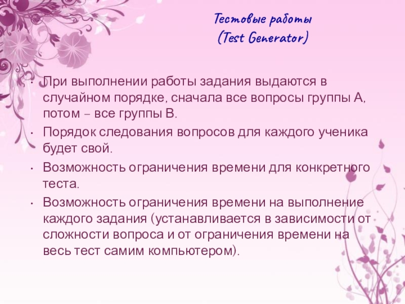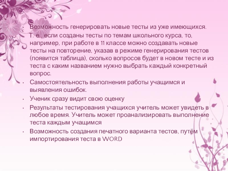 е., если созданы тесты по темам школьного курса, то, например, при работе в 11 классе можно создавать новые тесты на повторение, указав в режиме генерирования тестов (появится таблица), сколько вопросов будет в новом тесте и из теста с каким названием нужно выбрать каждый конкретный вопрос.