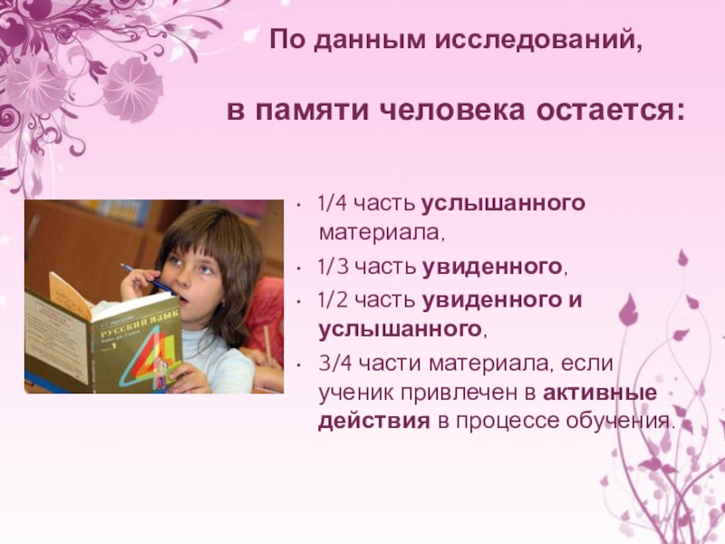 3/4 части материала, если ученик привлечен в активные действия в процессе обучения.