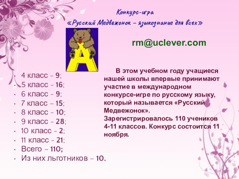 В этом учебном году учащиеся нашей школы впервые принимают участие в международном конкурсе-игре по русскому языку, который называется «Русский Медвежонок». Зарегистрировалось 110 учеников 4-11 классов. Конкурс состоится 11 ноября.