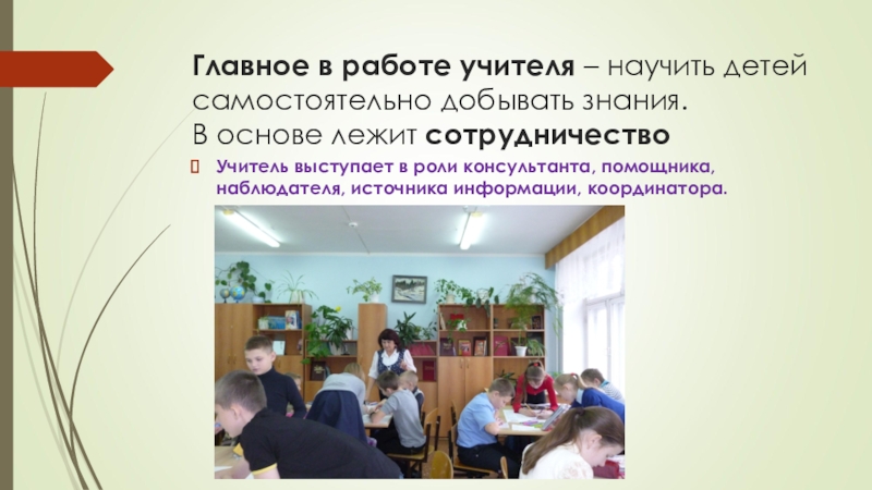 Учитель выступает в роли консультанта, помощника, наблюдателя, источника информации, координатора.