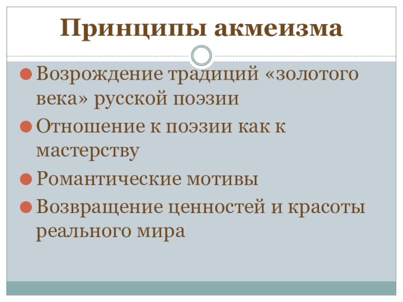 Принципы акмеизмаВозрождение традиций «золотого века» русской поэзииОтношение к поэзии как к мастерствуРомантические мотивыВозвращение ценностей и красоты реального