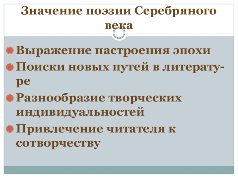 Значение поэзии Серебряного векаВыражение настроения эпохиПоиски новых путей в литерату-реРазнообразие творческих индивидуальностейПривлечение читателя к сотворчеству