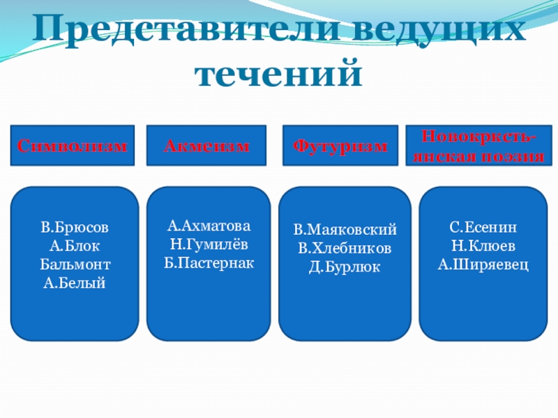 Представители ведущих теченийВ.БрюсовА.БлокБальмонтА.БелыйА.АхматоваН.ГумилёвБ.ПастернакВ.МаяковскийВ.ХлебниковД.БурлюкС.ЕсенинН.КлюевА.ШиряевецСимволизмАкмеизмФутуризмНовокрксть-янская поэзия