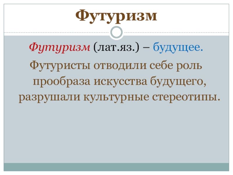 ФутуризмФутуризм (лат.яз.) – будущее.Футуристы отводили себе роль прообраза искусства будущего, разрушали культурные стереотипы.