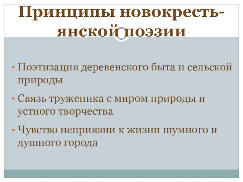 Принципы новокресть-янской поэзииПоэтизация деревенского быта и сельской природыСвязь труженика с миром природы и устного творчестваЧувство неприязни к