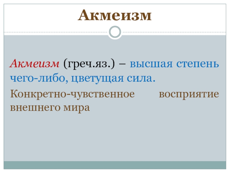 АкмеизмАкмеизм (греч.яз.) – высшая степень чего-либо, цветущая сила.Конкретно-чувственное восприятие внешнего мира