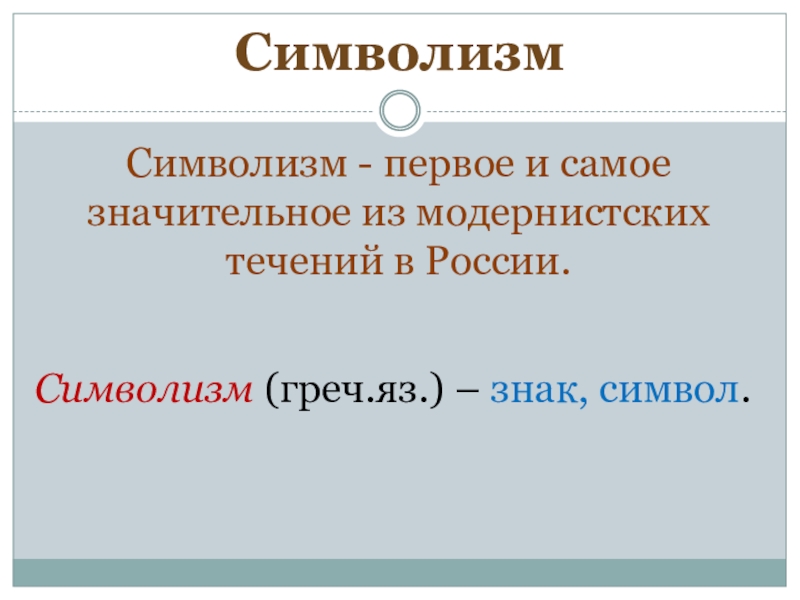 СимволизмСимволизм - первое и самое значительное из модернистских течений в России.Символизм (греч.яз.) – знак, символ.