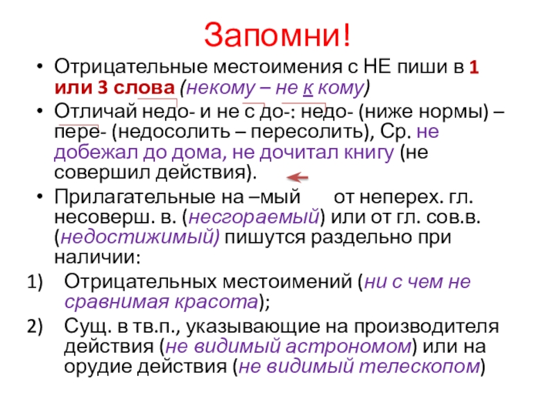 Запомни!Отрицательные местоимения с НЕ пиши в 1 или 3 слова (некому – не к кому)Отличай недо- и