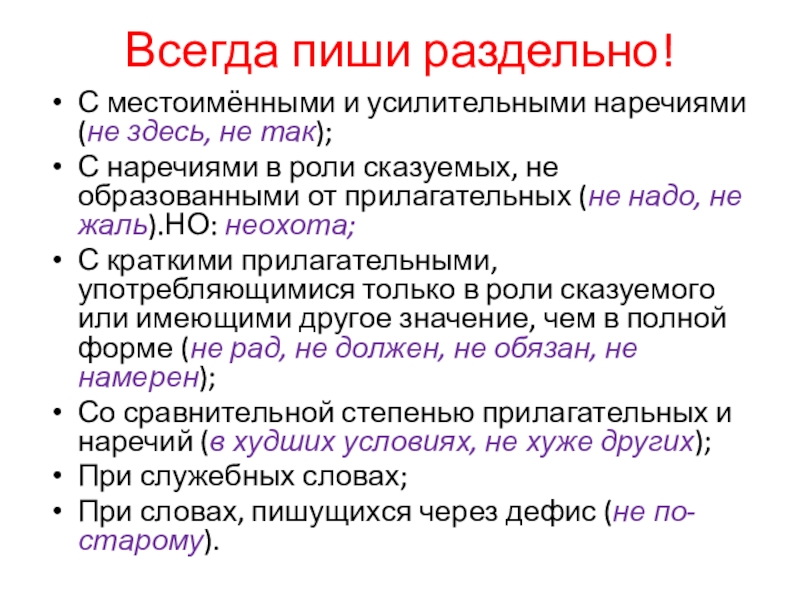 Всегда пиши раздельно!С местоимёнными и усилительными наречиями (не здесь, не так);С наречиями в роли сказуемых, не образованными от прилагательных (не надо, не жаль).НО: неохота;С краткими прилагательными, употребляющимися только в роли сказуемого или имеющими другое значение, чем