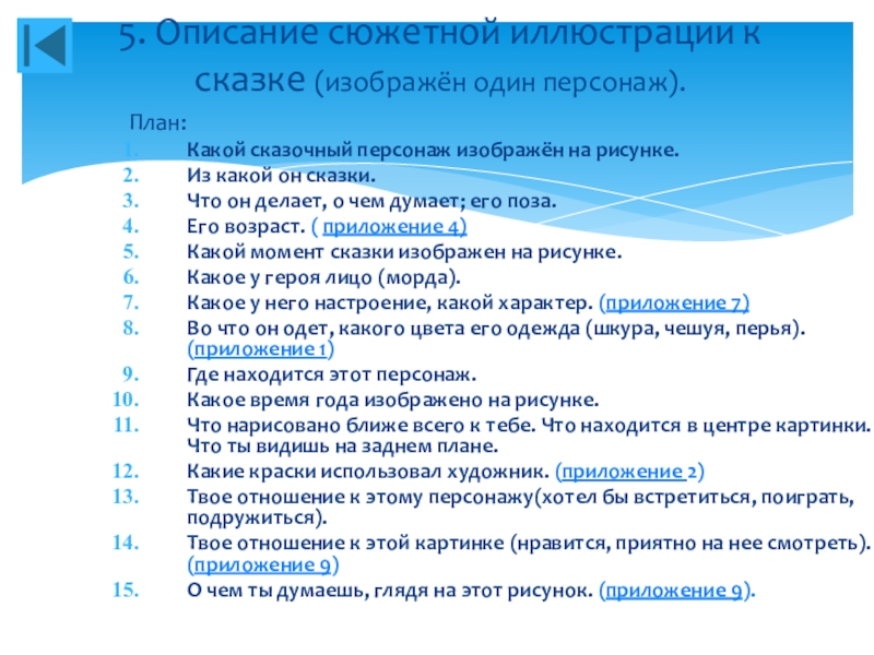 5. Описание сюжетной иллюстрации к сказке (изображён один персонаж).