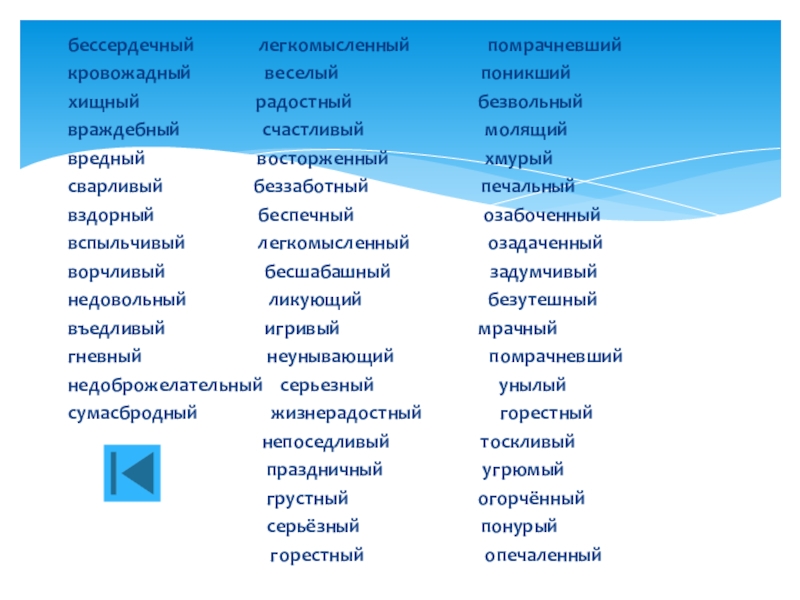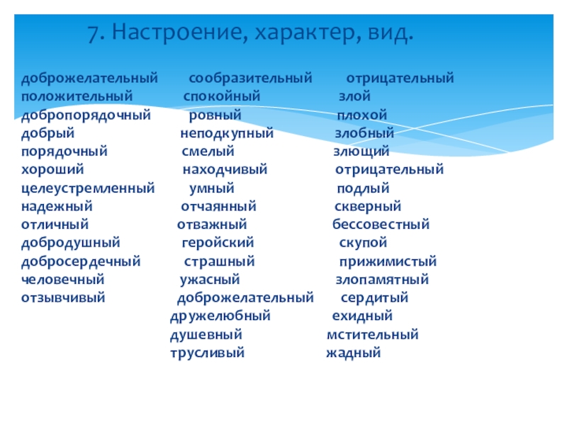 7. Настроение, характер, вид.