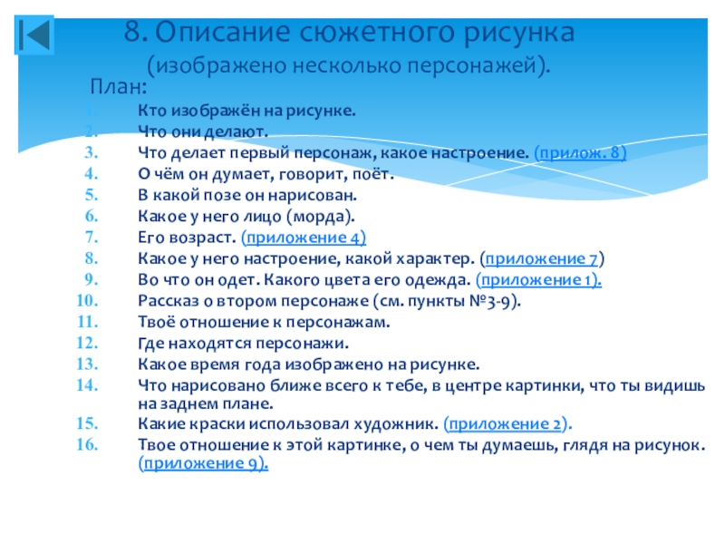 8. Описание сюжетного рисунка (изображено несколько персонажей).