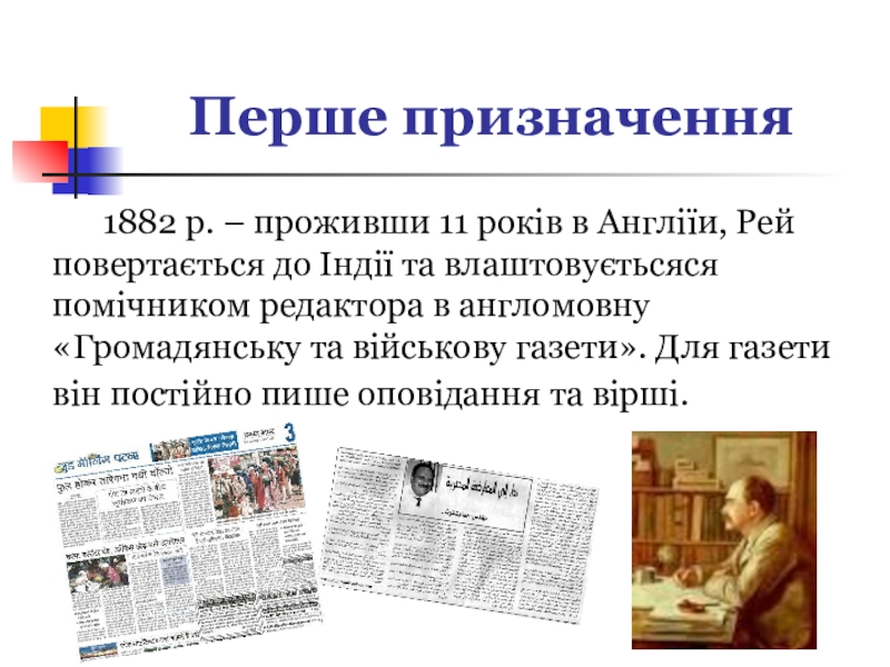 років в Англіїи, Рей повертається до Індії та влаштовуєтьсяся помічником редактора в англомовну «Громадянську та військову газети». Для газети він постійно пише оповідання та вірші.