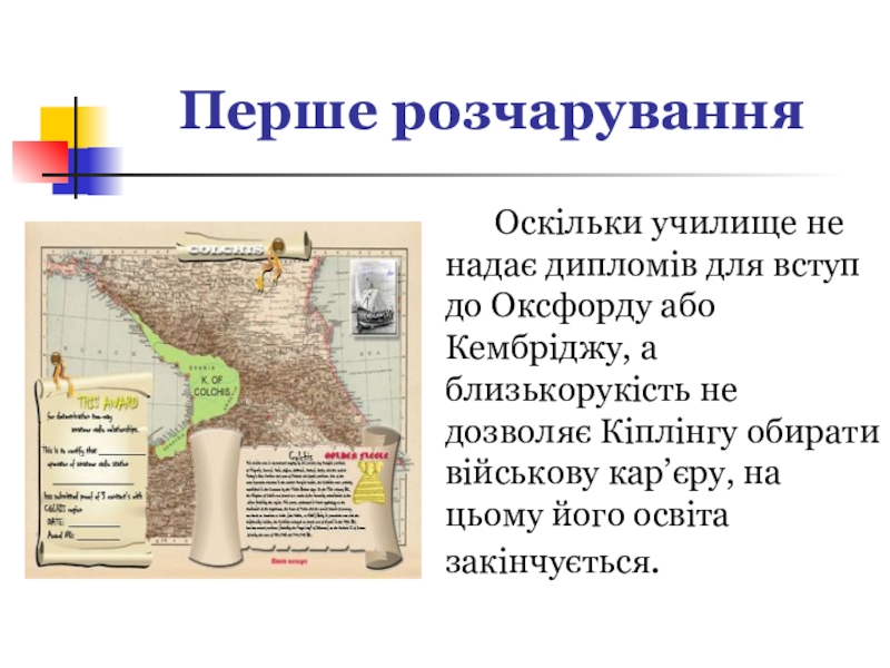 для вступ до Оксфорду або Кембріджу, а близькорукість не дозволяє Кіплінгу обирати військову кар’єру, на цьому його освіта закінчується.