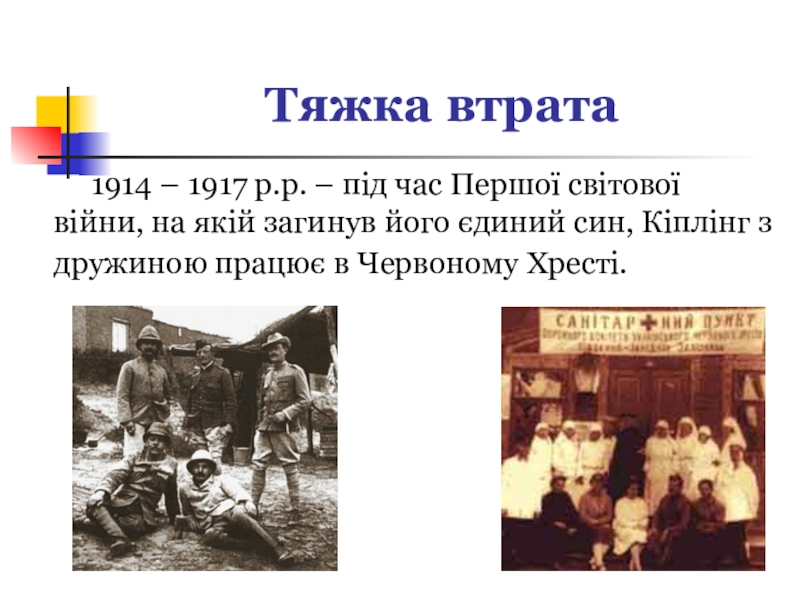під час Першої світової війни, на якій загинув його єдиний син, Кіплінг з дружиною працює в Червоному Хресті.