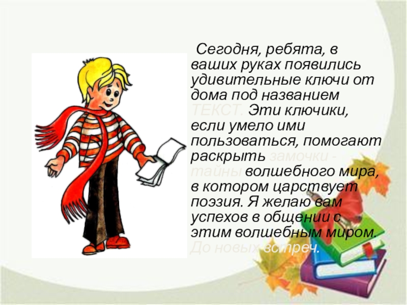 названием ТЕКСТ. Эти ключики, если умело ими пользоваться, помогают раскрыть замочки - тайны волшебного мира, в котором царствует поэзия. Я желаю вам успехов в общении с этим волшебным миром. До новых встреч.