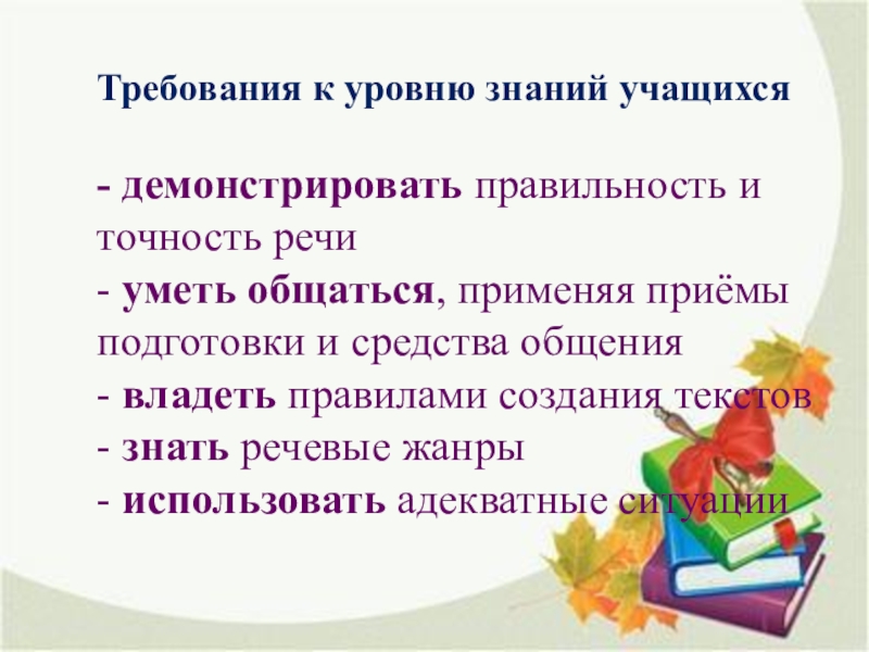 - владеть правилами создания текстов - знать речевые жанры