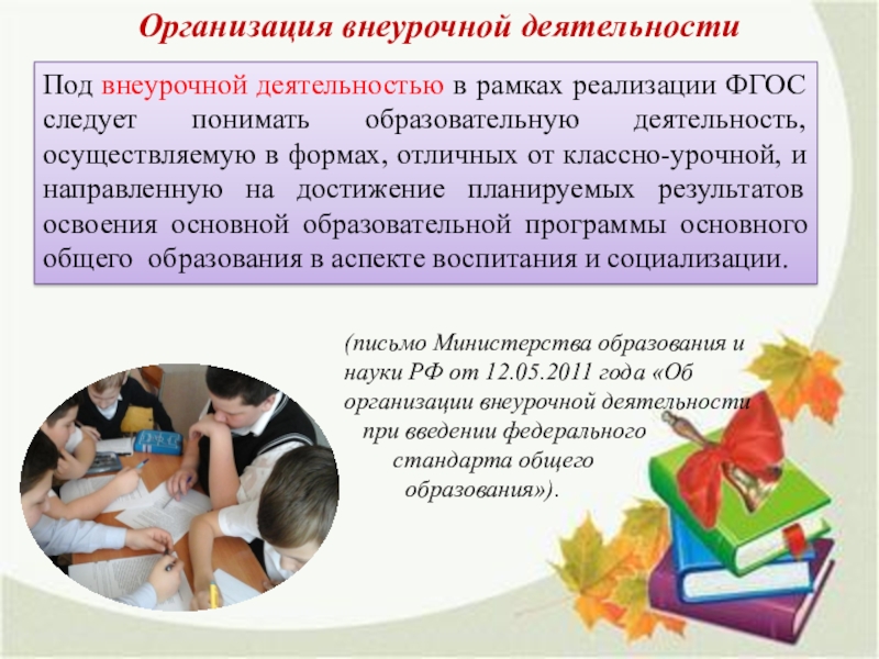 Под внеурочной деятельностью в рамках реализации ФГОС следует понимать образовательную деятельность, осуществляемую в формах, отличных от классно-урочной, и направленную на достижение планируемых результатов освоения основной образовательной программы основного общего образования в аспекте воспитания и социализации.