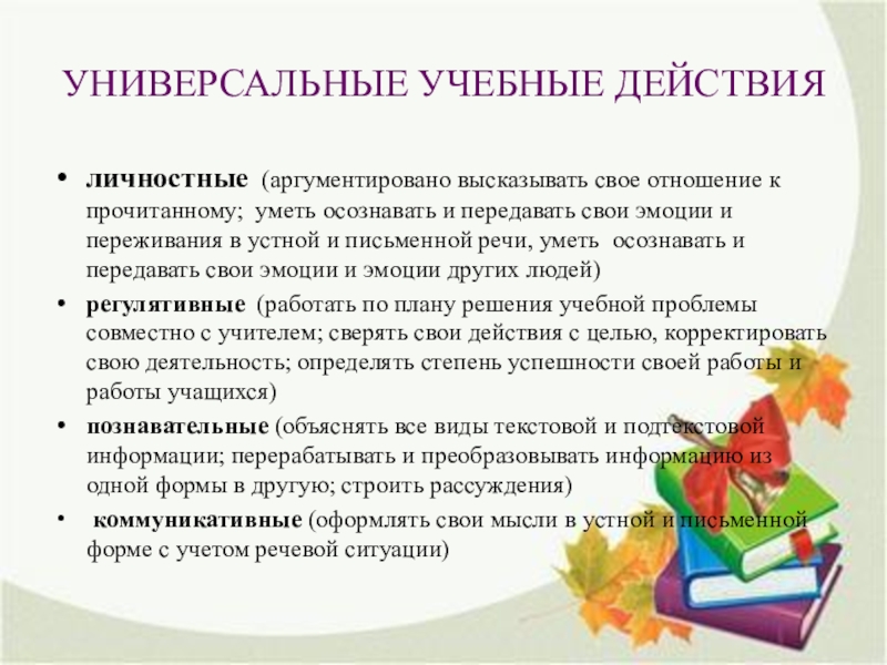 коммуникативные (оформлять свои мысли в устной и письменной форме с учетом речевой ситуации)