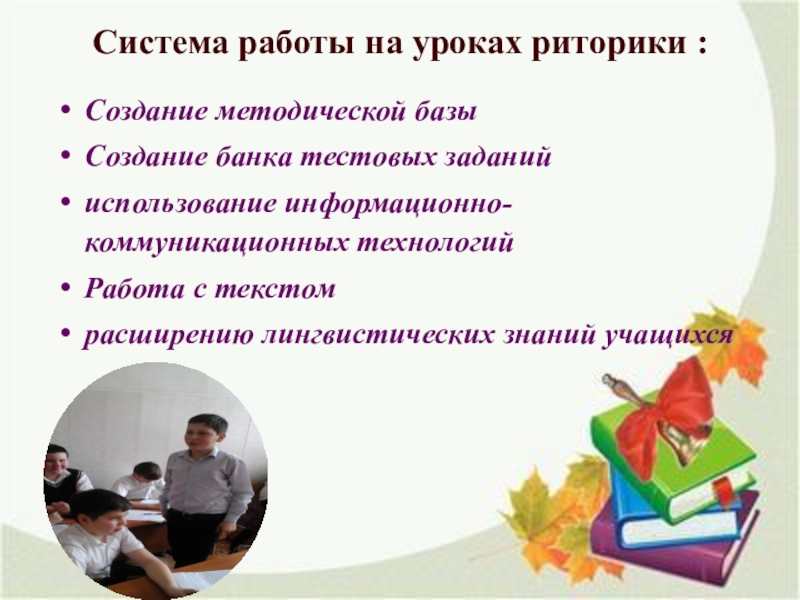 Слайд 14Система работы на уроках риторики :