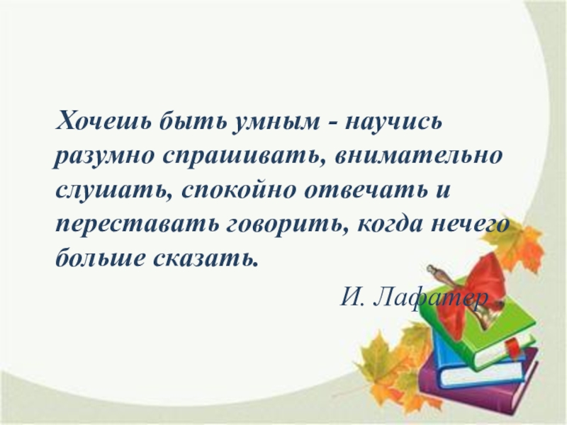 Слайд 30Хочешь быть умным - научись разумно спрашивать, внимательно слушать, спокойно отвечать