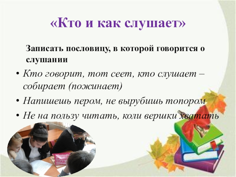 Записать пословицу, в которой говорится о слушании