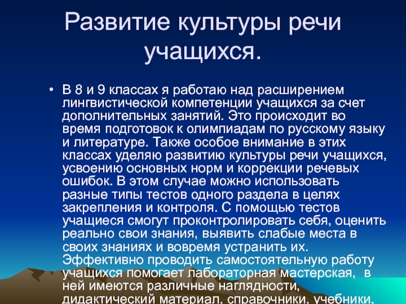 расширением лингвистической компетенции учащихся за счет дополнительных занятий. Это происходит во время подготовок к олимпиадам по русскому языку и литературе. Также особое внимание в этих классах уделяю развитию культуры речи учащихся, усвоению основных норм и коррекции речевых ошибок. В этом случае можно использовать разные типы тестов одного раздела в целях закрепления и контроля. С помощью тестов учащиеся смогут проконтролировать себя, оценить реально свои знания, выявить слабые места в своих знаниях и вовремя устранить их. Эффективно проводить самостоятельную работу учащихся помогает лабораторная мастерская, в ней имеются различные наглядности, дидактический материал, справочники, учебники, художественные произведения и т.п.