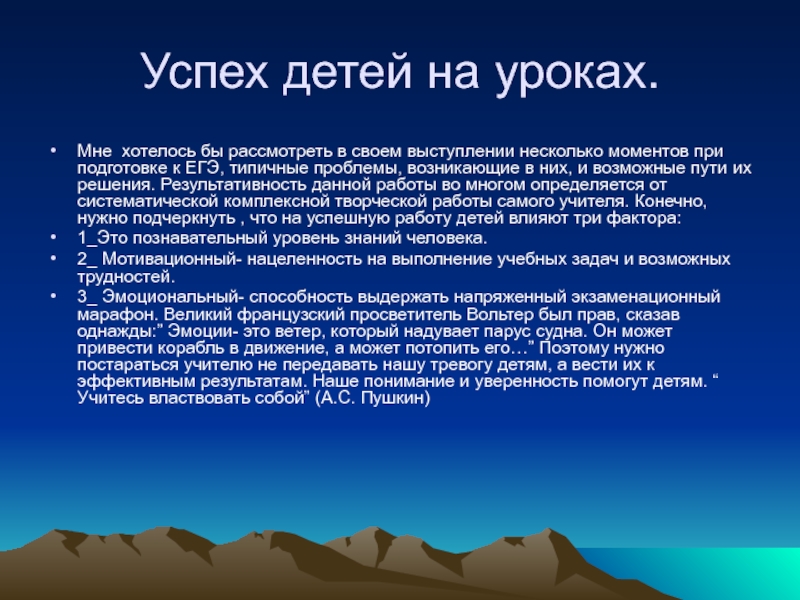 3_ Эмоциональный- способность выдержать напряженный экзаменационный марафон. Великий французский просветитель Вольтер был прав, сказав однажды:” Эмоции- это ветер, который надувает парус судна. Он может привести корабль в движение, а может потопить его…” Поэтому нужно постараться учителю не передавать нашу тревогу детям, а вести их к эффективным результатам. Наше понимание и уверенность помогут детям. “ Учитесь властвовать собой” (А.С. Пушкин)