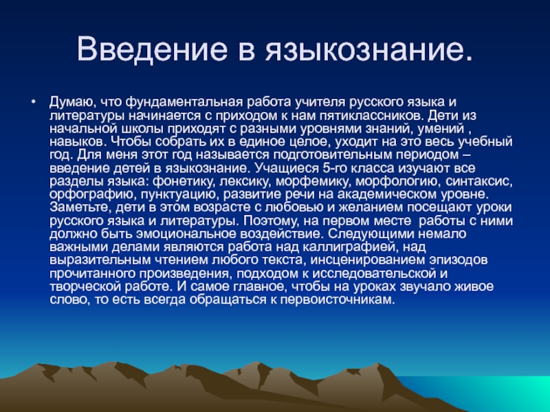 начинается с приходом к нам пятиклассников. Дети из начальной школы приходят с разными уровнями знаний, умений , навыков. Чтобы собрать их в единое целое, уходит на это весь учебный год. Для меня этот год называется подготовительным периодом – введение детей в языкознание. Учащиеся 5-го класса изучают все разделы языка: фонетику, лексику, морфемику, морфологию, синтаксис, орфографию, пунктуацию, развитие речи на академическом уровне. Заметьте, дети в этом возрасте с любовью и желанием посещают уроки русского языка и литературы. Поэтому, на первом месте работы с ними должно быть эмоциональное воздействие. Следующими немало важными делами являются работа над каллиграфией, над выразительным чтением любого текста, инсценированием эпизодов прочитанного произведения, подходом к исследовательской и творческой работе. И самое главное, чтобы на уроках звучало живое слово, то есть всегда обращаться к первоисточникам.