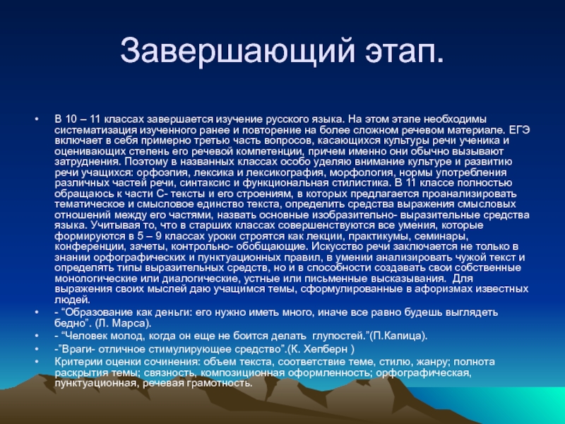 этом этапе необходимы систематизация изученного ранее и повторение на более сложном речевом материале. ЕГЭ включает в себя примерно третью часть вопросов, касающихся культуры речи ученика и оценивающих степень его речевой компетенции, причем именно они обычно вызывают затруднения. Поэтому в названных классах особо уделяю внимание культуре и развитию речи учащихся: орфоэпия, лексика и лексикография, морфология, нормы употребления различных частей речи, синтаксис и функциональная стилистика. В 11 классе полностью обращаюсь к части C- тексты и его строениям, в которых предлагается проанализировать тематическое и смысловое единство текста, определить средства выражения смысловых отношений между его частями, назвать основные изобразительно- выразительные средства языка. Учитывая то, что в старших классах совершенствуются все умения, которые формируются в 5 – 9 классах уроки строятся как лекции, практикумы, семинары, конференции, зачеты, контрольно- обобщающие. Искусство речи заключается не только в знании орфографических и пунктуационных правил, в умении анализировать чужой текст и определять типы выразительных средств, но и в способности создавать свои собственные монологические или диалогические, устные или письменные высказывания. Для выражения своих мыслей даю учащимся темы, сформулированные в афоризмах известных людей.