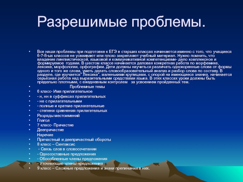 начинаются именно с того, что учащиеся 6-7-8-ых классов не усваивают или плохо закрепляют учебный материал. Нужно помнить, что владение лингвистической, языковой и коммуникативной компетенциями- дело комплексное и формируемое годами. В шестом классе начинается деловая конкретная работа по морфемике, лексике, морфологии, орфографии. Дети должны научиться различать однокоренные слова от формы одного и того же слова, уметь делать словообразовательный анализ и разбор слова по составу. В разделе, где изучается” Лексика”, маленькими крупицами, с опорой на имеющиеся знания, начинается серьёзная работа над выразительными средствами языка. В этих классах уроки должны быть предельно плотными, с ежедневным контролем за усвоением пройденных тем.