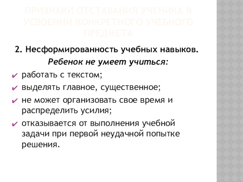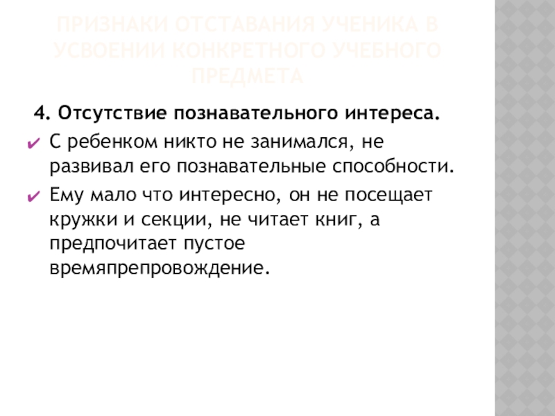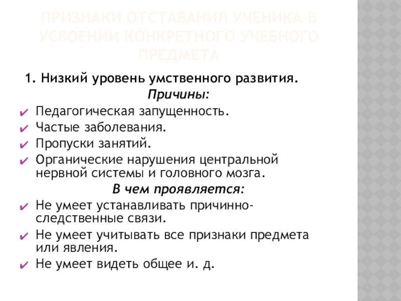Не выполняет домашние задания, не слушает на уроках, потому что ленив, неорганизован, следовательно имеет пробелы в знаниях и навыках, недостатки познавательной деятельности.